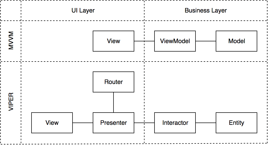 While MVVM has only a view component in UI layer, VIPER separates UI responsibilities into 3 components, which are View, Presenter and Router. It’s also obvious that business layer looks pretty much the same.